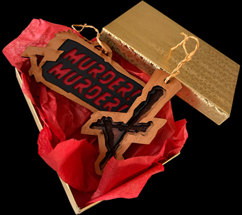 Behold! Two fit-to-be-hanged wooden ornaments: one bearin’ The Mark of Cain, the other chantin’ “Murder! Murder!”