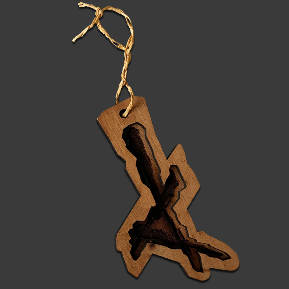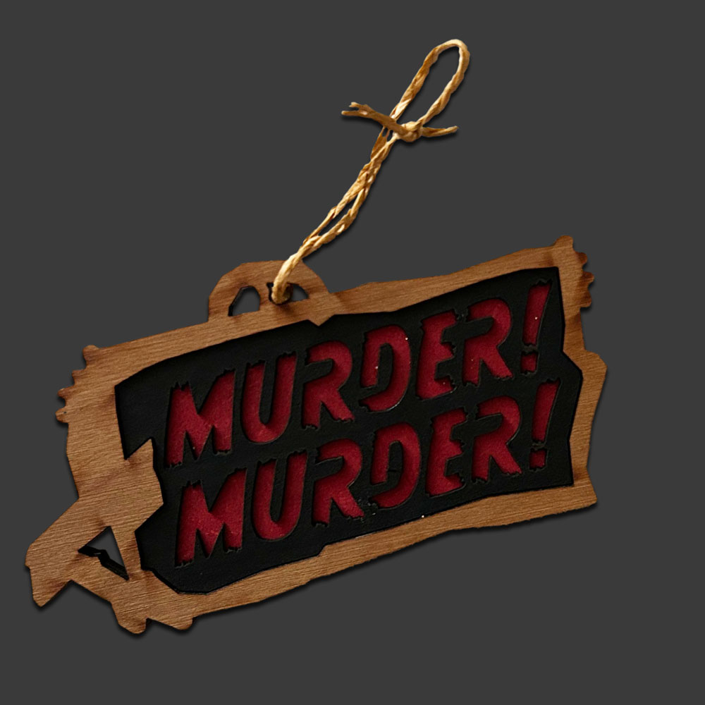 Behold! Two fit-to-be-hanged wooden ornaments: one bearin’ The Mark of Cain, the other chantin’ “Murder! Murder!”